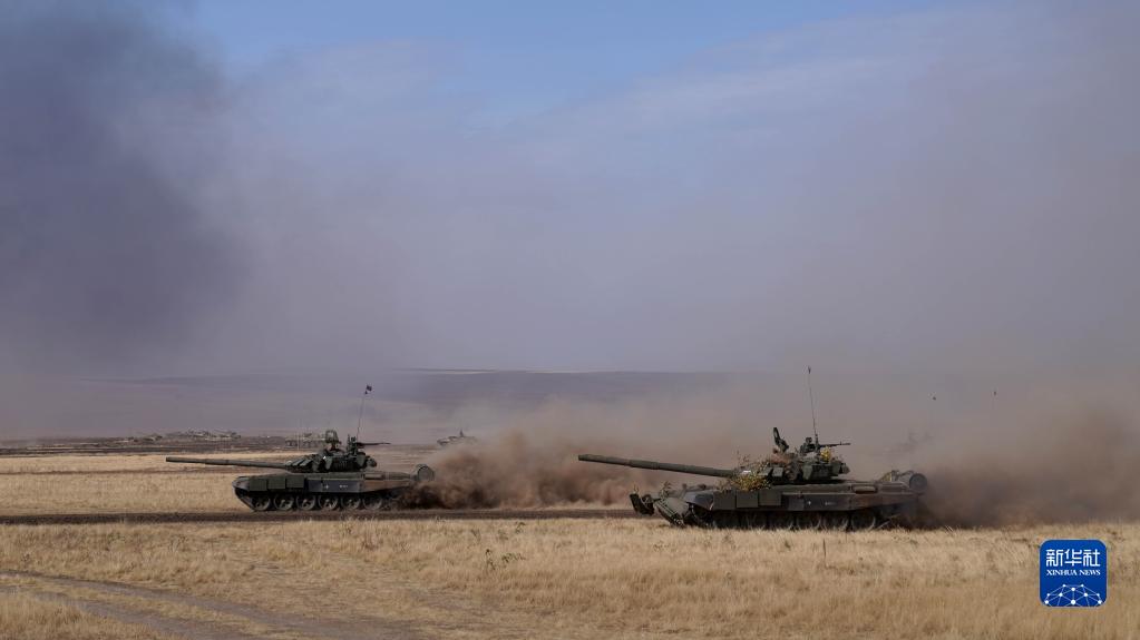 9月23日,在俄罗斯奥伦堡州东古兹靶场举行的“和平使命-2021”上海合作组织联合反恐军事演习实兵实弹演习中,多国联合部队地面突击群坦克部队迅猛出击。新华社记者 梅世雄 摄 在近一个小时演练时间内,各国参演部队演练了封锁诱骗、火力打击、 防御战斗、进攻战斗、追击行动5个战斗阶段。 一望无际的东古兹草原,铺展开一幅壮阔的秋日演兵图。