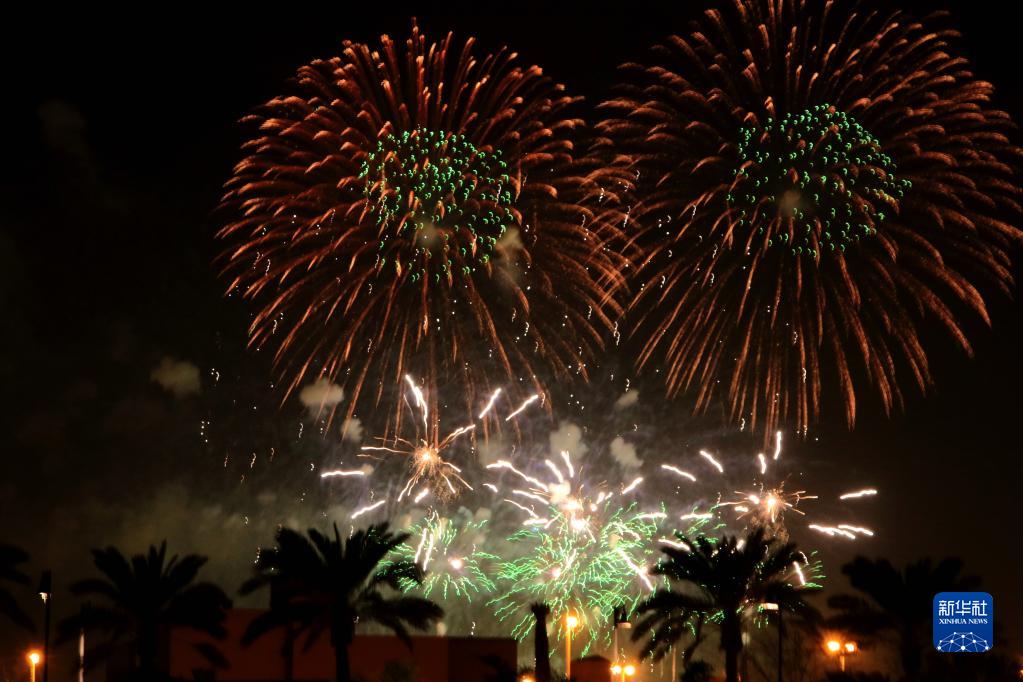 这是9月23日在沙特阿拉伯首都利雅得拍摄的国庆日的烟花。