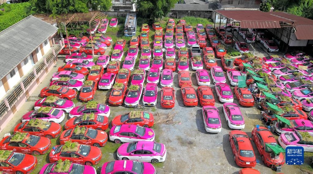 在泰国首都曼谷市郊的一个停车场,上百辆出租车因新冠疫情停运超过一年,出租车公司工作人员在车顶和引擎盖上堆土种菜,分发给员工和失业司机。新华社记者王腾摄