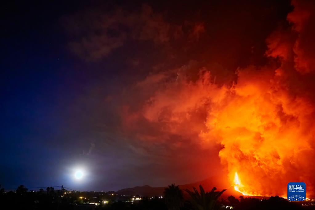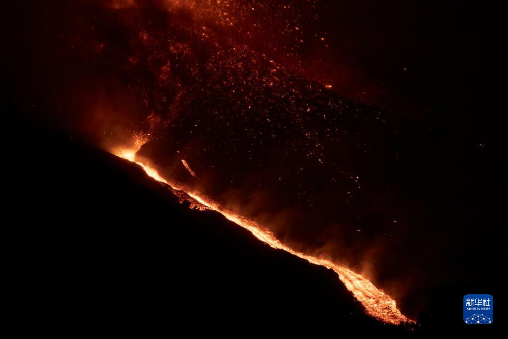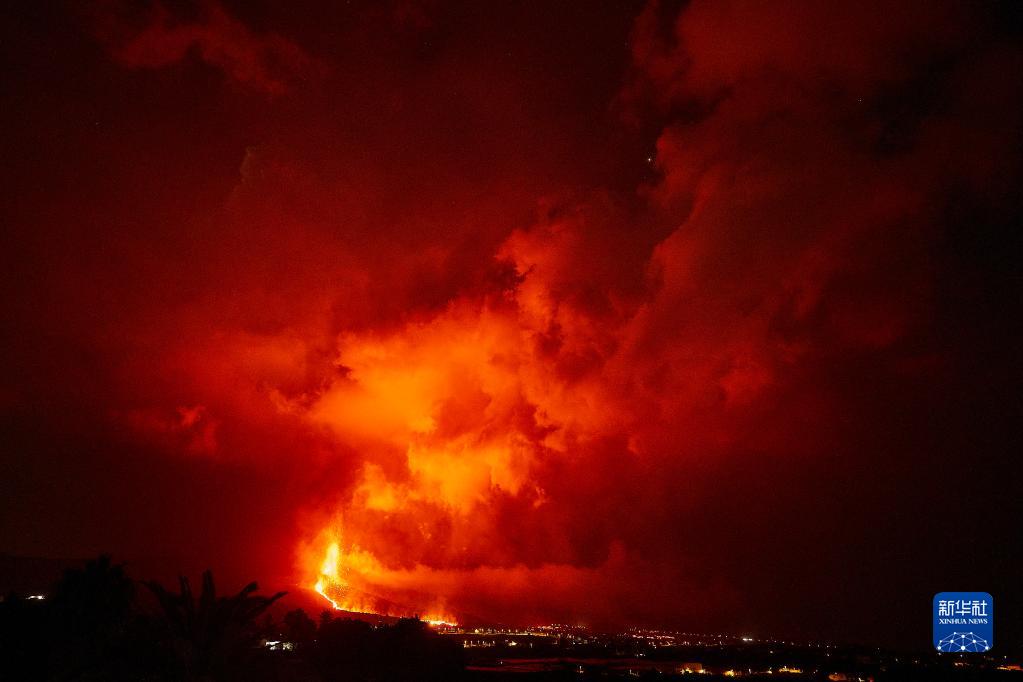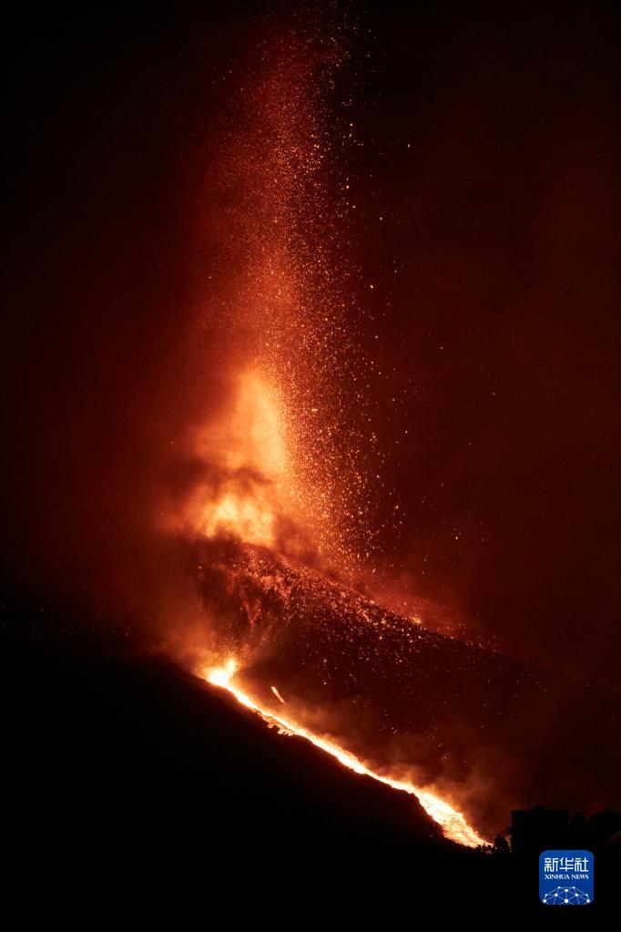 这是9月24日在西班牙拉帕尔马岛拍摄的老昆布雷火山喷发的景象。 目前,已有超过400座房屋被火山流出的岩浆摧毁。 新华社记者 孟鼎博 摄