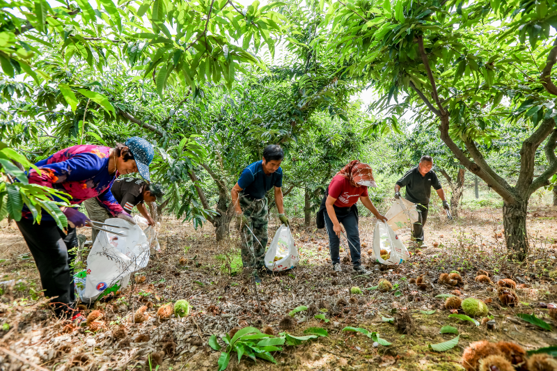 ▲丹东板栗进入收获季,村民们在板栗园里捡拾刚刚打下来的板栗。沈晓凯 摄
