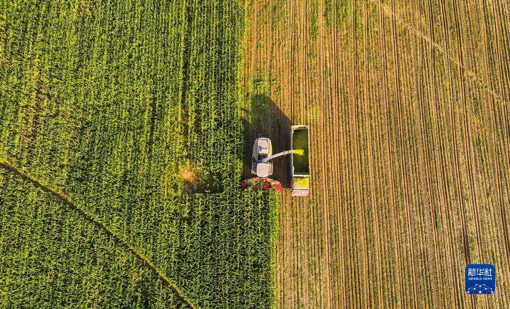9月26日,达拉特旗展旦召苏木的农民使用大型机械收获青贮玉米(无人机照片)。