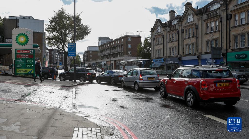 9月27日,车辆在英国伦敦一家加油站外排队加油。