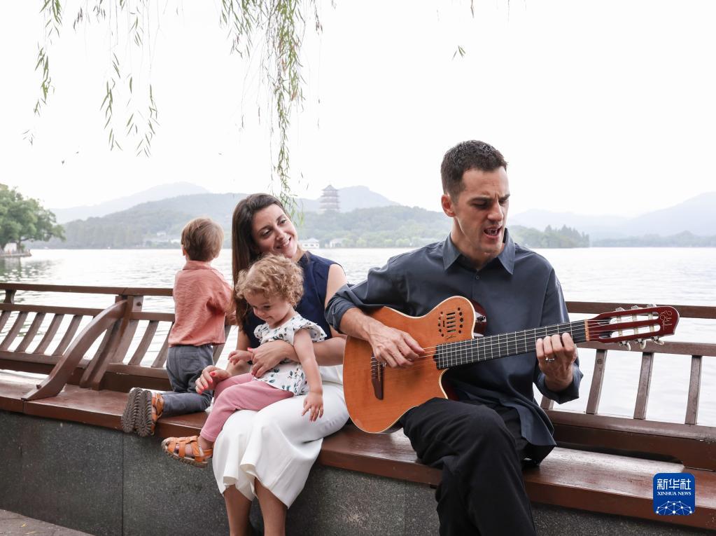 10月7日,格莱美获奖者里卡多·福格特(右)和家人在西湖游览时弹唱。 蒙特勒爵士音乐节是全球历史最悠久、专业水准最高的音乐节之一。受全球疫情的影响,原本2020年就应举办的蒙特勒(中国)爵士音乐节推迟到今年举办,原计划吸引超万人观众的演出规模也不得不压缩到仅仅几百人,海外一些著名乐队也无法抵达杭州现场演出。 国庆假期期间,蒙特勒(中国)爵士音乐节采取“小而精”的方式,选择在西湖旁边的一家酒店,举办了9场沉浸式演出,其中包括邀请格莱美奖获得者在内的中外音乐家到场演出,给观众带来了一场音乐盛宴。 新华社记者 陈建力 摄