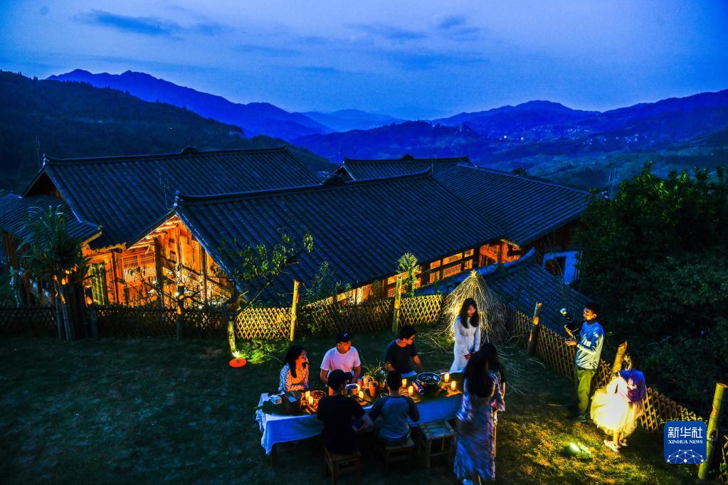 10月5日,游客在贵州省榕江县计划乡加宜村一家民宿享用露天烛光晚餐。