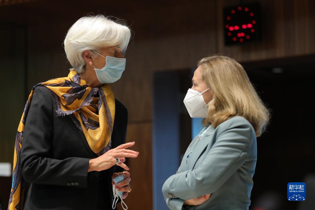 10月4日,在卢森堡举行的欧元集团会议开始前,欧洲央行行长拉加德(左)与西班牙第二副首相兼经济大臣卡尔维尼奥交谈。