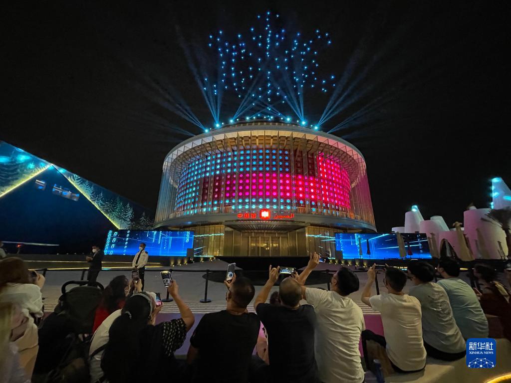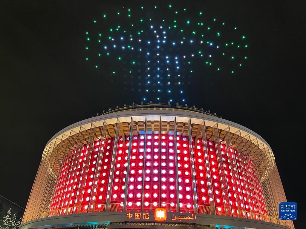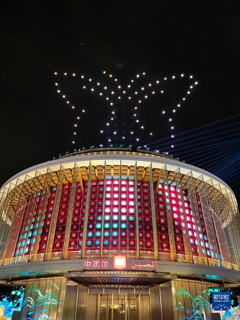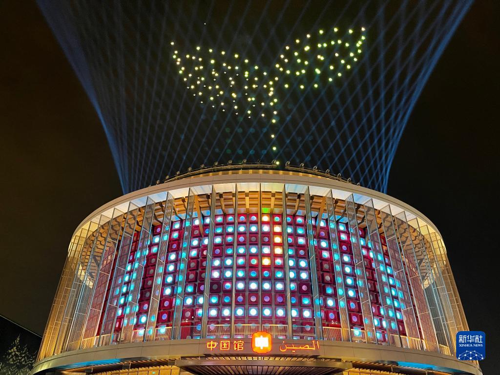 这是10月4日在阿拉伯联合酋长国迪拜拍摄的迪拜世博会中国馆大型主题灯光秀。 迪拜世博会中国馆自10月1日开馆以来,每晚上演的大型主题灯光秀受到游客的欢迎。灯光秀以“华夏之光”为主题,通过中国馆外墙上1312块LED发光体与150架无人机的矩阵表演相配合,实现大范围的动态视觉效果,为游客献上一场震撼的视听盛宴。 新华社记者 苏小坡 摄