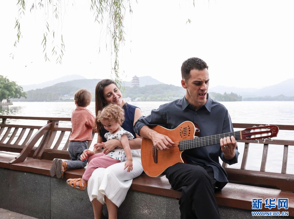 10月7日,格莱美获奖者里卡多·福格特(右)和家人在西湖游览时弹唱。新华社记者 陈建力 摄