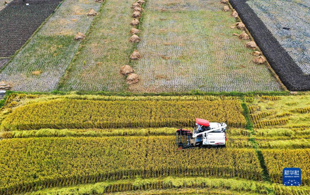 10月8日,农民驾驶收割机在麻江县坝芒乡乐坪村抢收水稻(无人机照片)。 当日是寒露节气,在贵州省黔东南苗族侗族自治州麻江县坝芒乡乐坪村,农民驾驶收割机抢收晚稻,确保颗粒归仓。 新华社记者 杨文斌 摄