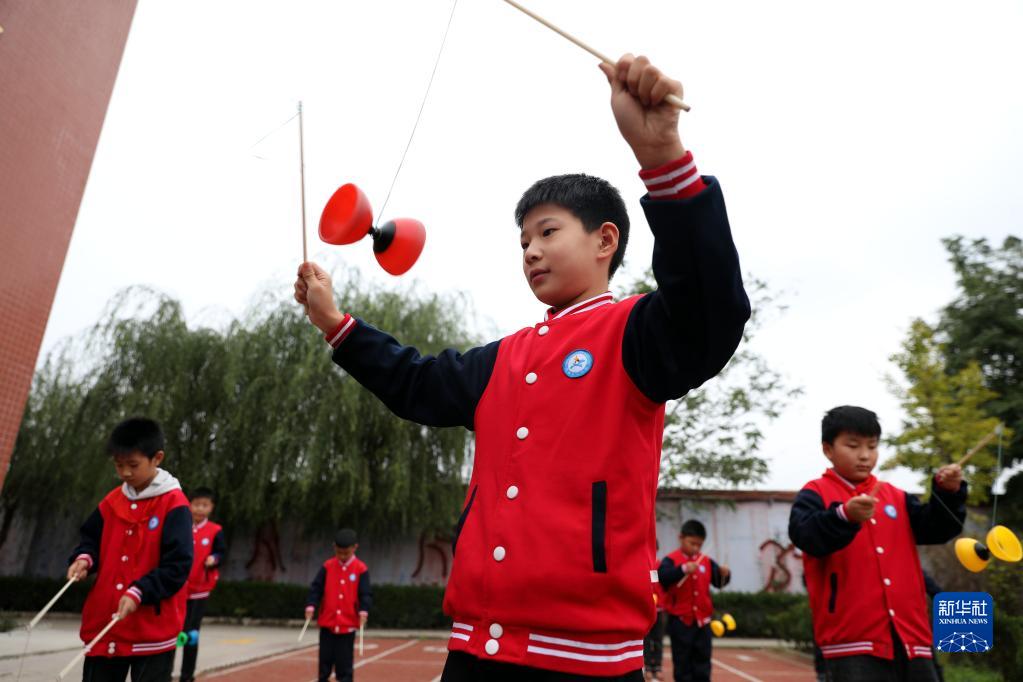 10月8日,河北省邢台市任泽区达二小学学生在练习抖空竹。新华社记者 骆学峰 摄