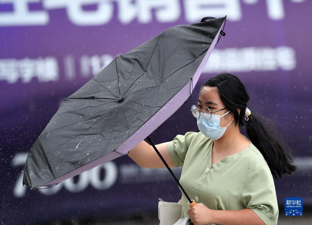 10月8日,在海南省海口市,一名行人的雨伞被大风吹翻。 当日,位于南海的热带低压已于5时加强为今年第17号台风“狮子山”,最大风力8级,预计10月8日夜间至9日上午在海南南部沿海登陆。海南省气象局继续发布暴雨四级预警,并提升台风四级预警为三级预警。 新华社记者 郭程 摄