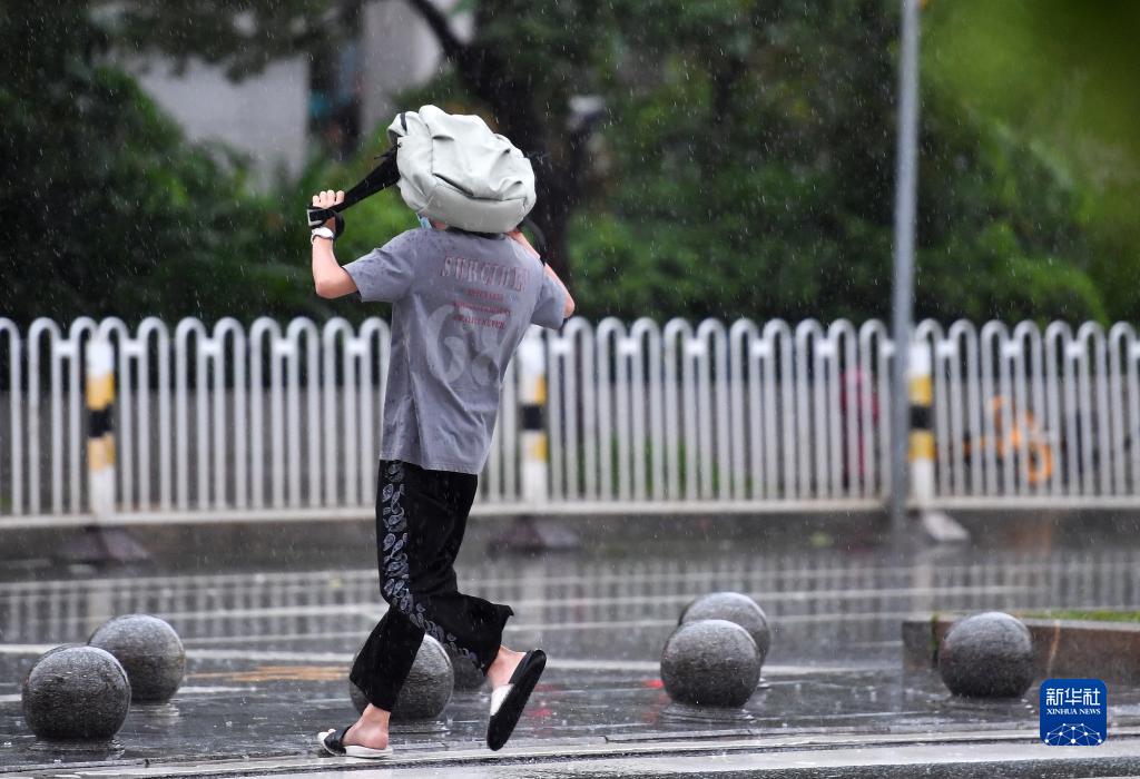 10月8日,在海南省海口市,市民和游客在雨中前行。 当日,位于南海的热带低压已于5时加强为今年第17号台风“狮子山”,最大风力8级,预计10月8日夜间至9日上午在海南南部沿海登陆。海南省气象局继续发布暴雨四级预警,并提升台风四级预警为三级预警。 新华社记者 郭程 摄