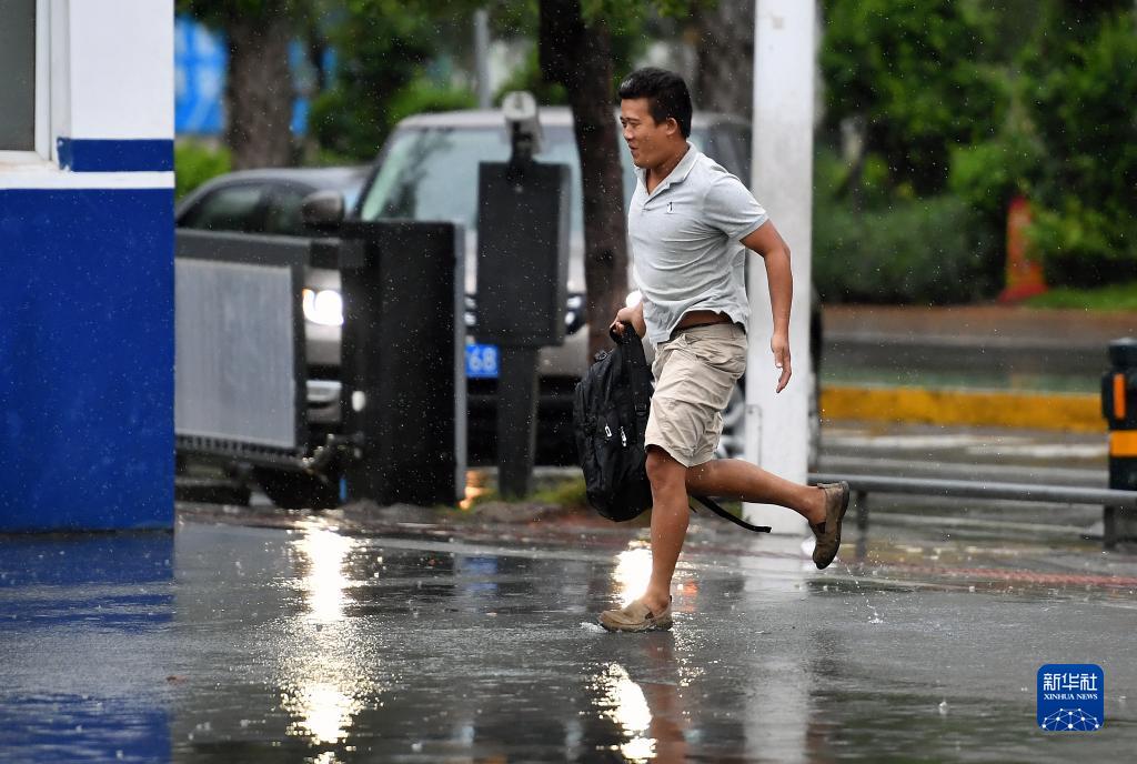 10月8日,在海南省海口市,一名行人在雨中奔跑。 当日,位于南海的热带低压已于5时加强为今年第17号台风“狮子山”,最大风力8级,预计10月8日夜间至9日上午在海南南部沿海登陆。海南省气象局继续发布暴雨四级预警,并提升台风四级预警为三级预警。 新华社记者 郭程 摄