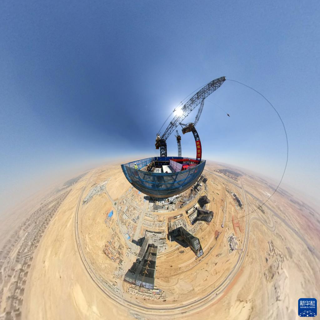 这是2021年6月17日拍摄的埃及新首都中央商务区标志塔主体建筑封顶建设现场(全景相机拍摄)。 新华社记者 隋先凯 摄