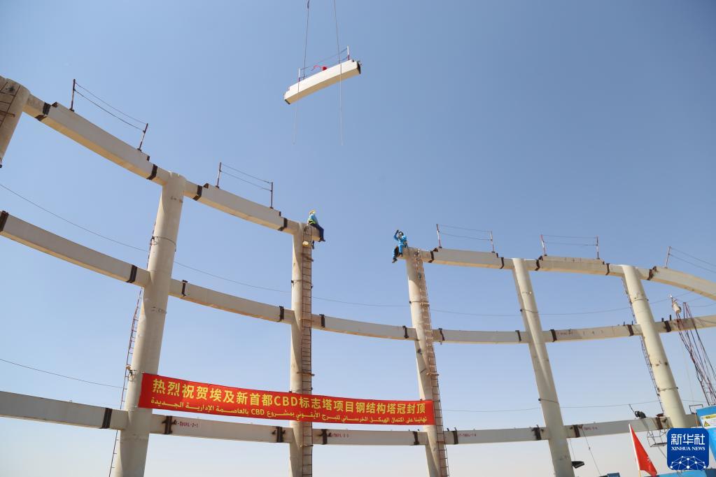 这是2021年8月24日拍摄的埃及新首都中央商务区标志塔主体钢结构封顶现场。
