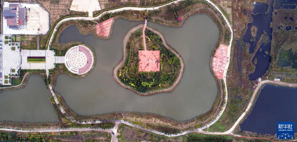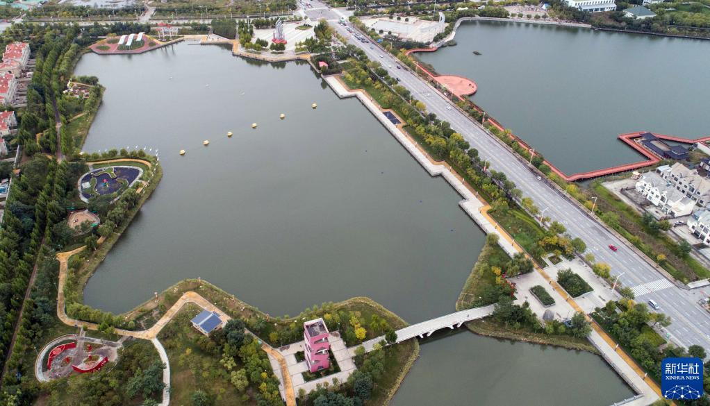 这是10月10日拍摄的河北省黄骅市地坤湖公园景色(无人机照片)。 河北省黄骅市地处渤海之滨,土壤盐碱化程度高。近年来,当地在城市建设中秉持自然、生态、节约理念,对散落在城市各处的废弃坑塘、洼地等进行扩挖、改造,实施一系列治理盐碱措施,建成公园、游园80余处,绿化面积不断增加,改善了城市生态环境,拓展了市民休闲娱乐空间。 新华社记者 骆学峰 摄