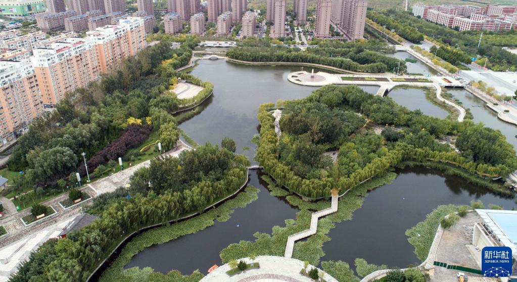 这是10月10日拍摄的河北省黄骅市文星湖公园景色(无人机照片)。 河北省黄骅市地处渤海之滨,土壤盐碱化程度高。近年来,当地在城市建设中秉持自然、生态、节约理念,对散落在城市各处的废弃坑塘、洼地等进行扩挖、改造,实施一系列治理盐碱措施,建成公园、游园80余处,绿化面积不断增加,改善了城市生态环境,拓展了市民休闲娱乐空间。 新华社记者 骆学峰 摄