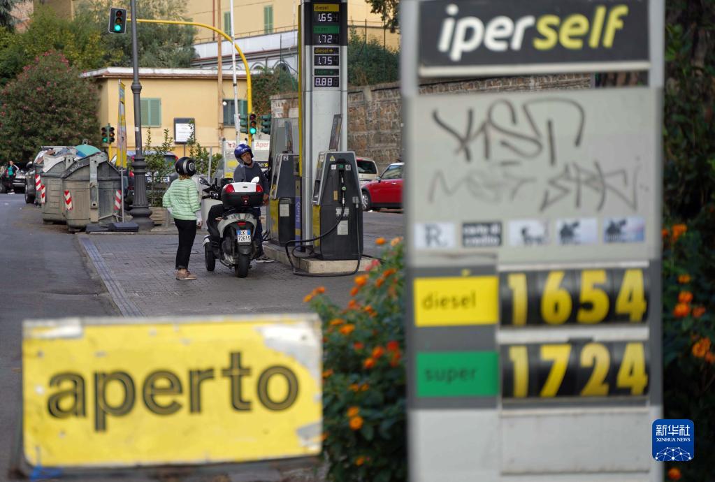 10月9日,人们在意大利罗马的一家加油站内为摩托车加油。