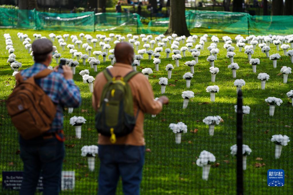 10月8日,人们在美国纽约炮台公园内为悼念枪支暴力遇难者摆放的白色瓶花前驻足。