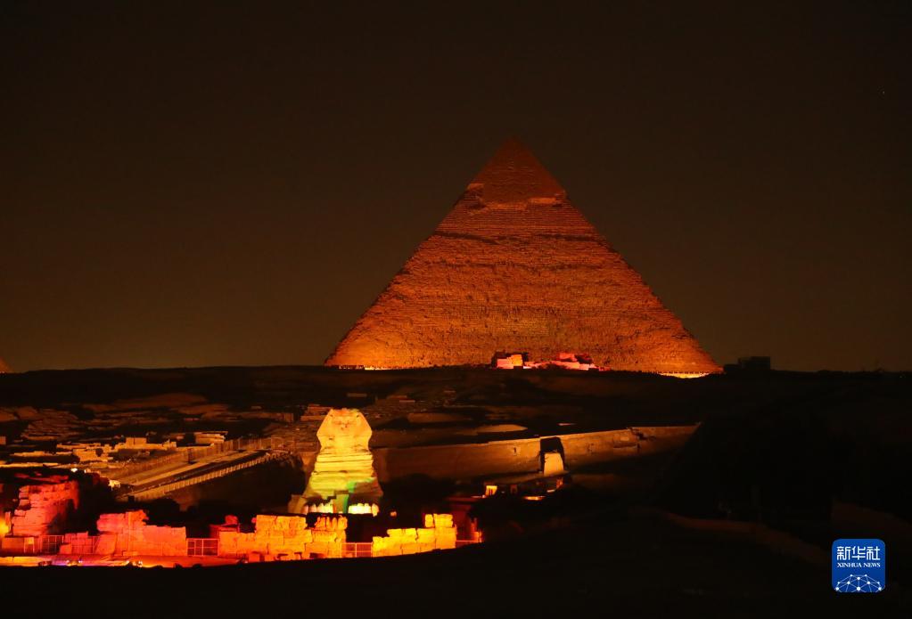 9月27日,埃及吉萨金字塔群景区为游客上演声光秀。