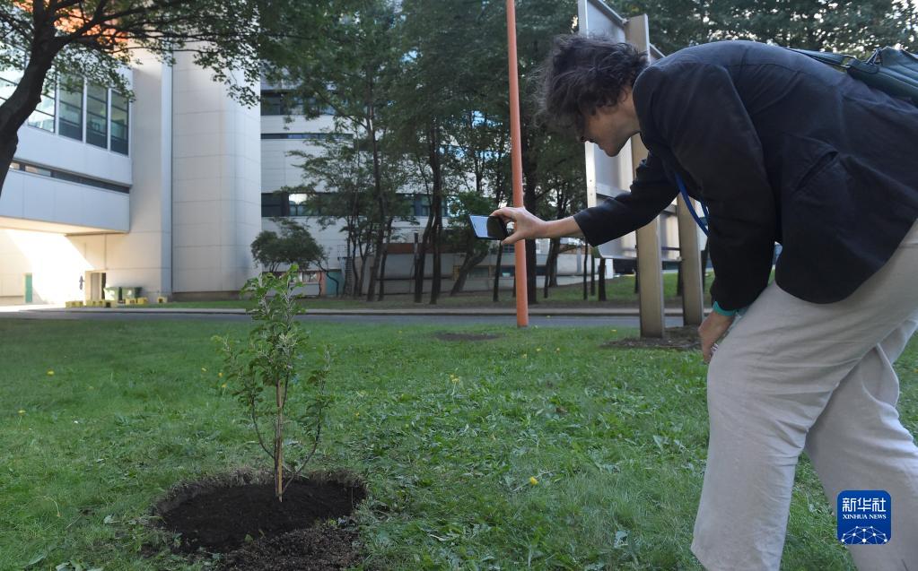 9月28日,工作人员在联合国维也纳国际中心院内为新栽种的“牛顿太空树苗”拍照。 当日,一株特殊苹果树苗被栽种在联合国维也纳国际中心院内,以激励后代的太空科学家。据介绍,树苗的种子来自于启发了牛顿万有引力理论的苹果树,并被带入太空培育。这棵苹果树位于英国伍尔索普庄园,已有400年树龄。 新华社记者 郭晨 摄