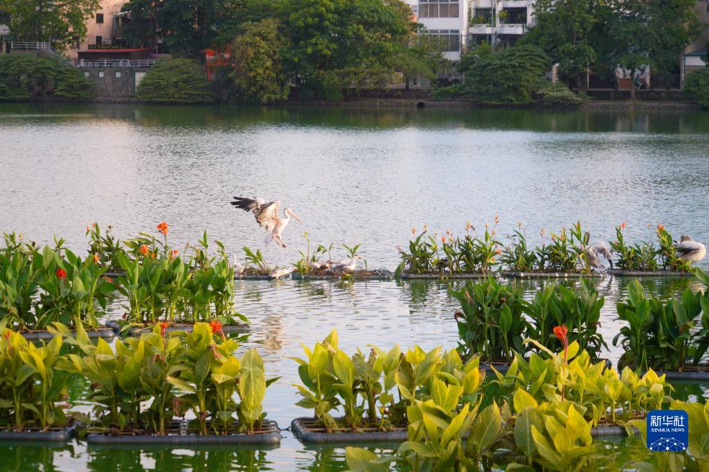 正因为如此,贝拉湖上的斑嘴鹈鹕数量比以往大增,最多时这里会聚集上百只。清晨,斑嘴鹈鹕会在水中匆忙“划桨”,寻找猎物。饱餐之后,它们便会悠然地游向生态浮岛,或者扇动翅膀在天空中快速飞行后降落在生态浮岛上。