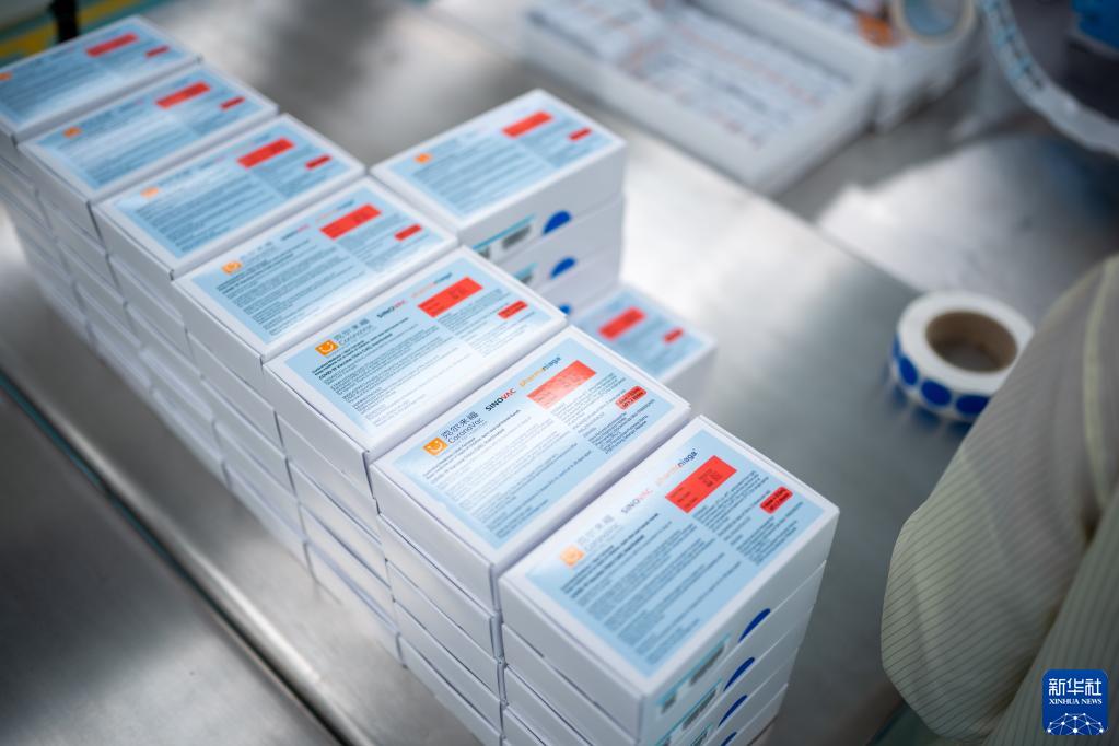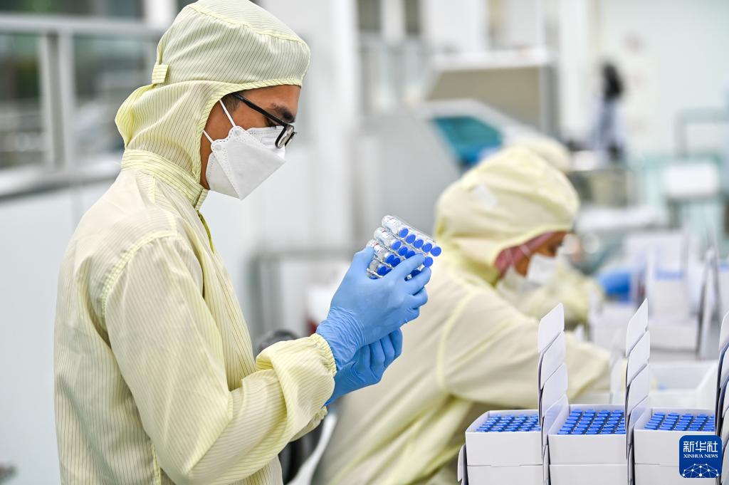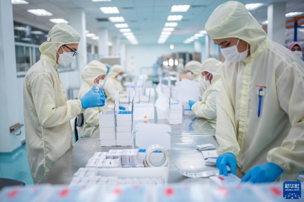 10月5日,在马来西亚吉隆坡郊区的发马公司灌装工厂,工人在包装本地灌装生产的科兴疫苗。新华社记者 朱炜 摄