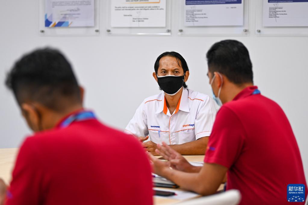 10月5日,在马来西亚吉隆坡郊区的发马公司灌装工厂,发马公司生产主管穆赫德·萨哈鲁丁(中)与同事开会。新华社记者 朱炜 摄