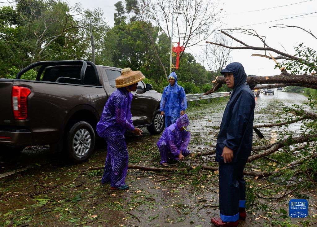 10月13日,在万宁市山根镇,工作人员清理被台风刮倒的大树。