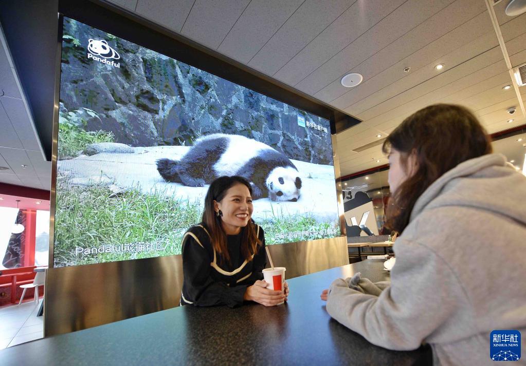 当日,熊猫会客厅在成都春熙路肯德基熊猫餐厅揭幕。在这里,顾客能够体验到利用人工智能(AI)技术自动剪辑的海量熊猫短视频、熊猫慢直播和有趣的互动。新华社记者 刘坤 摄