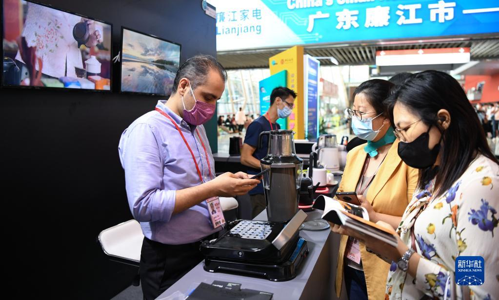 10月15日,一名国外采购商(左)在广交会上和一家小家电展商洽谈。