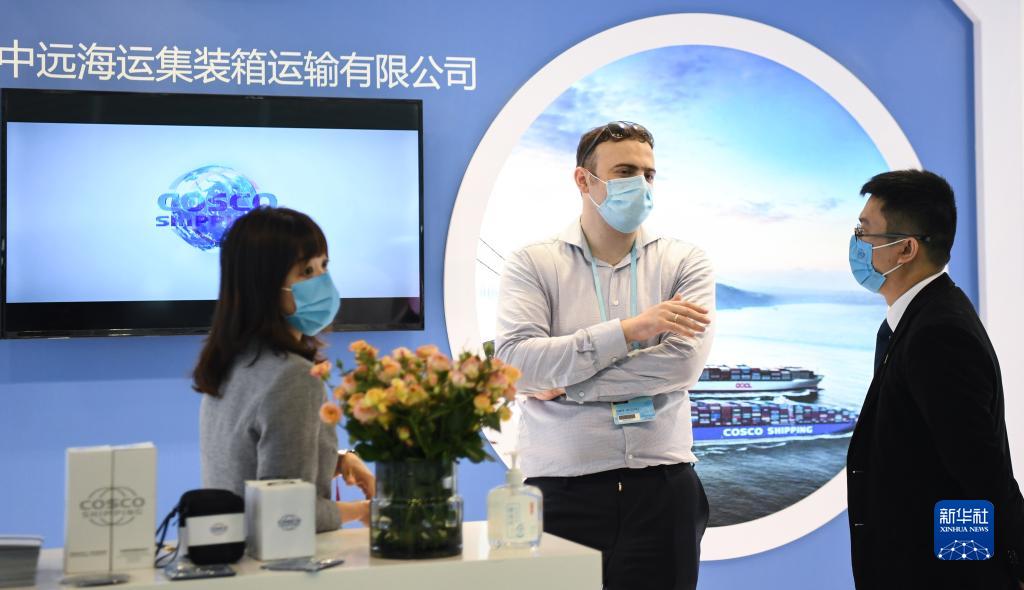 10月15日,一名国外采购商(中)在中远海运展台洽谈。新华社记者 邓华 摄