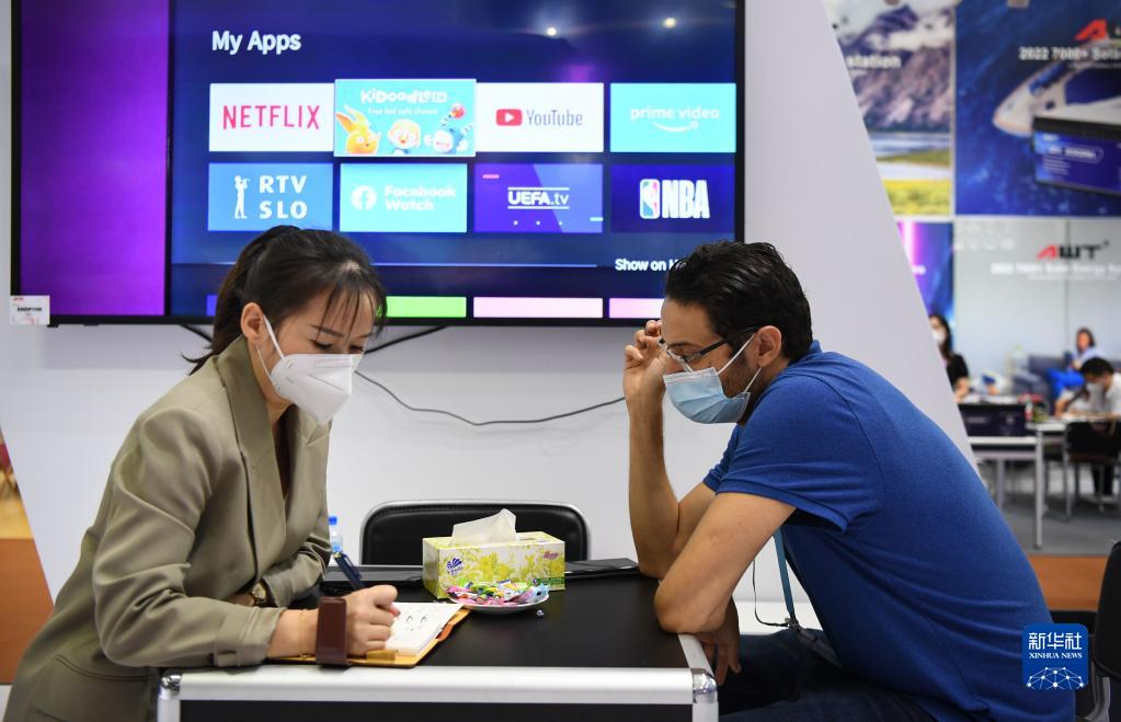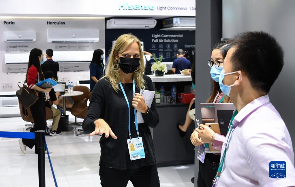 10月15日,一名国外采购商(前左)在海信展台洽谈。新华社记者 邓华 摄