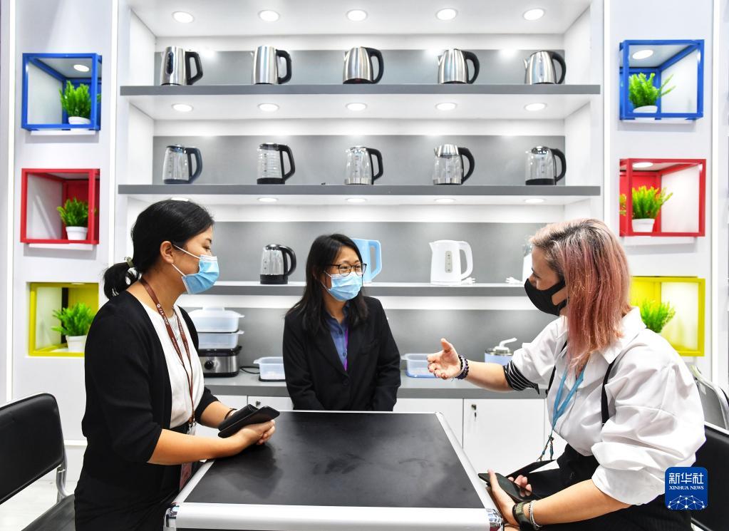 10月15日,来自意大利的工业设计师劳敏妮(右)在广交会上和一家电器展商洽谈。新华社记者 刘大伟 摄
