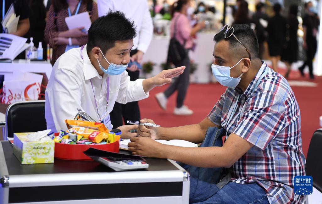 10月15日,一名国外参会者(中)在广交会上和展商洽谈。新华社记者 刘大伟 摄