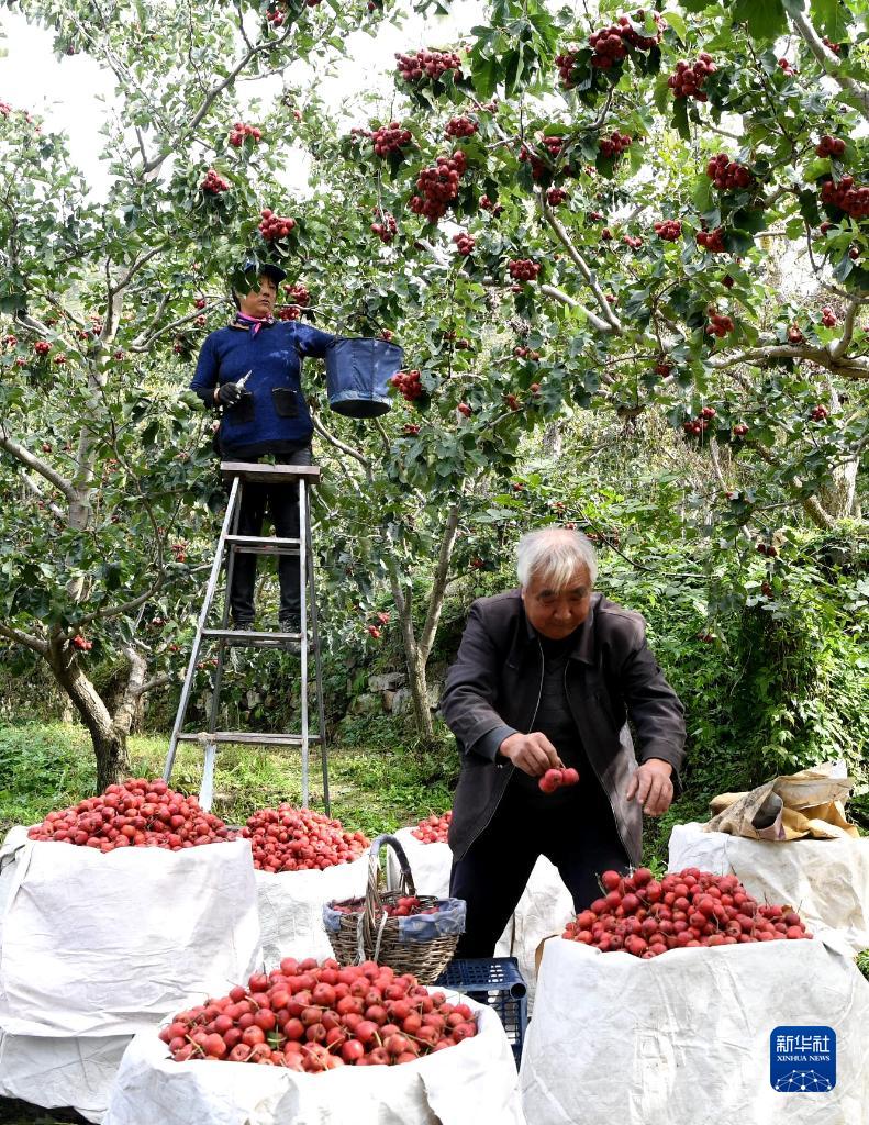 当下正值山楂收获期,天津市蓟州区官庄镇梁后庄村村民忙碌着采摘山楂,喜迎丰收。新华社记者 马平 摄