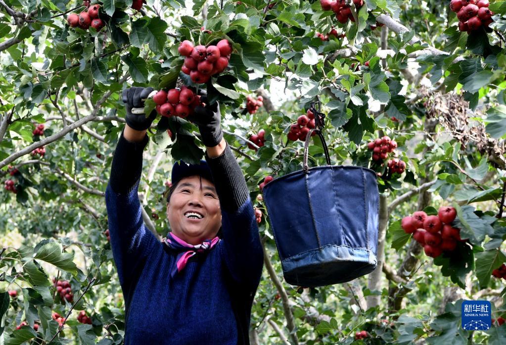10月15日,在天津市蓟州区官庄镇梁后庄村,村民采摘山楂。新华社记者 马平 摄