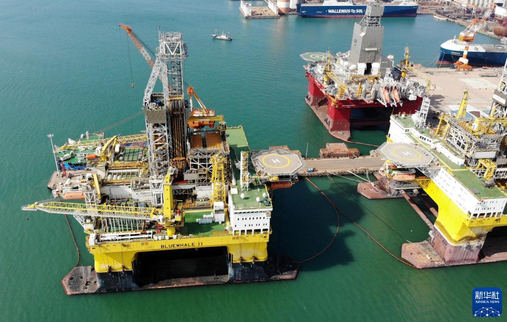 “蓝鲸1号”(前右)及姊妹平台“蓝鲸2号”正在其生产基地中集来福士海洋工程有限公司烟台基地进行维护和保养(10月18日摄,无人机照片)。