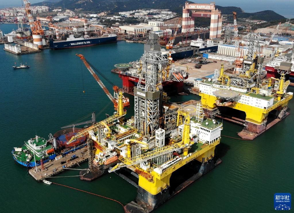 “蓝鲸1号”(前右)及姊妹平台“蓝鲸2号”(前左)正在其生产基地中集来福士海洋工程有限公司烟台基地进行维护和保养(10月18日摄,无人机照片)。