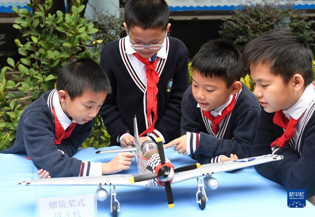 10月19日,在广西河池市金城江区第三小学,学生在参观科学节活动现场展出的飞机模型。