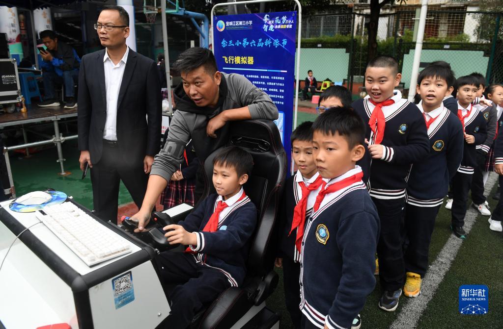 10月19日,在广西河池市金城江区第三小学,学生在科学节活动现场操作飞行模拟器。