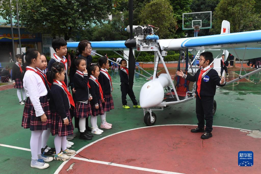 10月19日,在广西河池市金城江区第三小学,一名学生在科学节活动现场讲解一款飞机的结构。