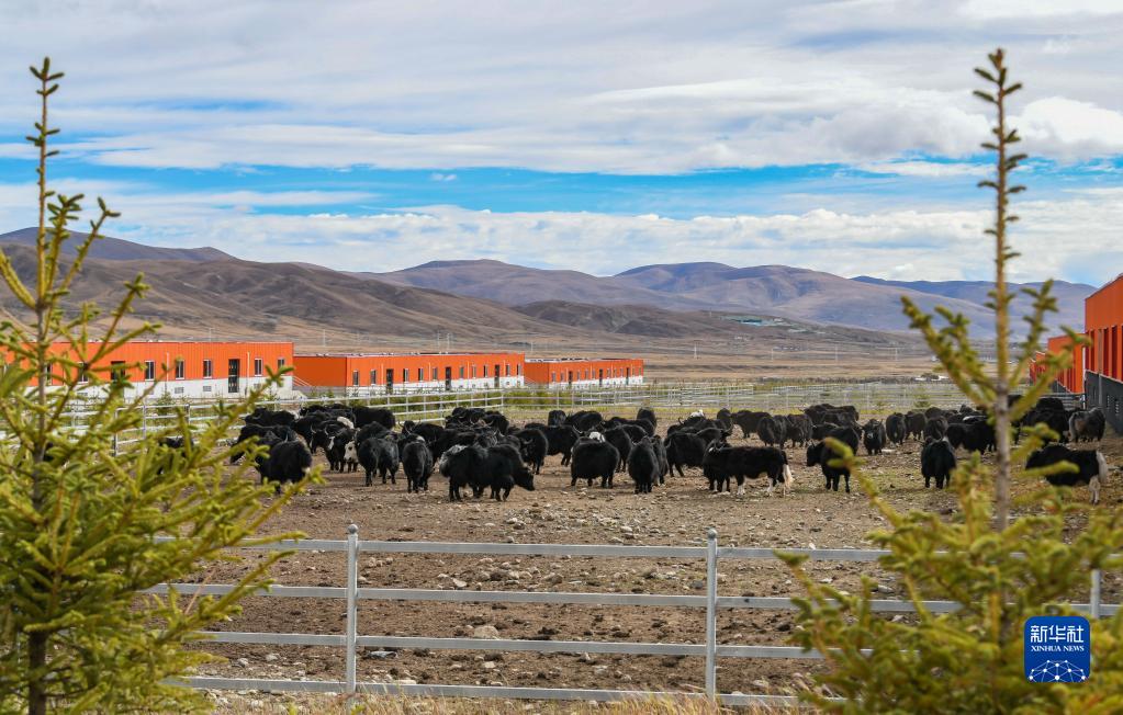 10月20日,在四川省甘孜藏族自治州理塘县牦牛产业园区,牦牛群在户外活动场活动。
