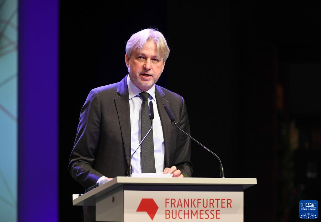 10月19日,法兰克福书展主席于尔根·博斯在德国法兰克福举行的记者会上讲话。