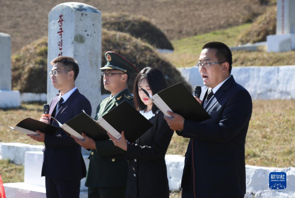 10月23日,在朝鲜咸镜南道西北部长津湖畔的长津邑中国人民志愿军烈士合葬墓地,中国驻朝鲜大使馆外交官代表朗诵献给长眠于此的志愿军英烈的祭文。新华社记者 江亚平 摄 在长津湖战役中,中国人民志愿军在武器装备和后勤保障严重落后于对手的情况下,凭着钢铁般的意志和大无畏精神,将拥有绝对制空权和精良武器装备的美军精锐之师打得丢盔卸甲,是抗美援朝战争中极为重要的一场战役。 10月下旬的长津湖畔天高云淡,阳光明媚,碧绿的湖水在阳光照耀下泛着白光。远道而来的中国外交官风尘仆仆,怀着沉重的心情在志愿军烈士墓前默哀致敬,祭酒献花。 他们满怀深情地朗诵献给长眠于此的志愿军英烈的祭文:“你们选择了远行,把对父母的挂念藏在心底,去书写英雄的故事;你们选择了忠诚,把妻儿的照片揣进怀里,去成就不朽的传奇;你们选择了使命,把对祖国的大爱扛在肩头,去追逐高贵的信仰……”气氛庄严肃穆,在场的不少人都洒下热泪。