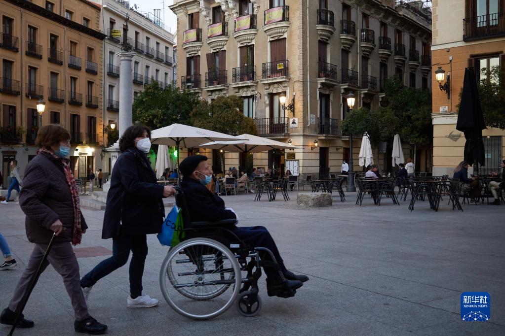 10月25日,戴口罩的行人走过西班牙马德里市中心。 西班牙卫生部25日发布的统计数据显示,该国累计新冠确诊病例达5002217例。 新华社记者 孟鼎博 摄