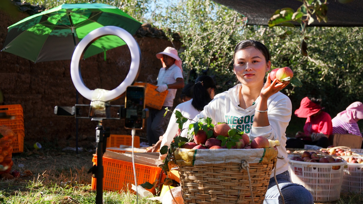 △拼多多主播在产地直播,向消费者介绍盐源苹果特点。李里 摄