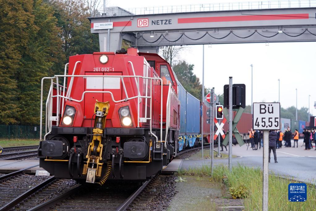 10月26日,首列“上海号”中欧班列驶入德国汉堡的货场。 德国汉堡26日举行仪式,欢迎首列“上海号”中欧班列顺利抵达。9月28日,首发“上海号”列车装着50个满载服装鞋帽、玻璃器皿、汽车配件、精密仪器等货物的集装箱,从上海一路向西,经新疆阿拉山口口岸出境,开往汉堡。该班列目前每周开行一次,之后将逐步增加开行频次并开拓新线路。 新华社记者王勍摄