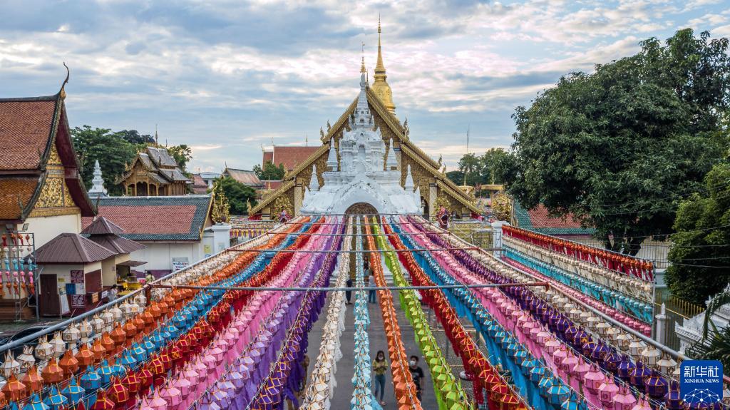 这是10月25日在泰国南奔府哈利奔猜寺用无人机拍摄的各色灯笼。