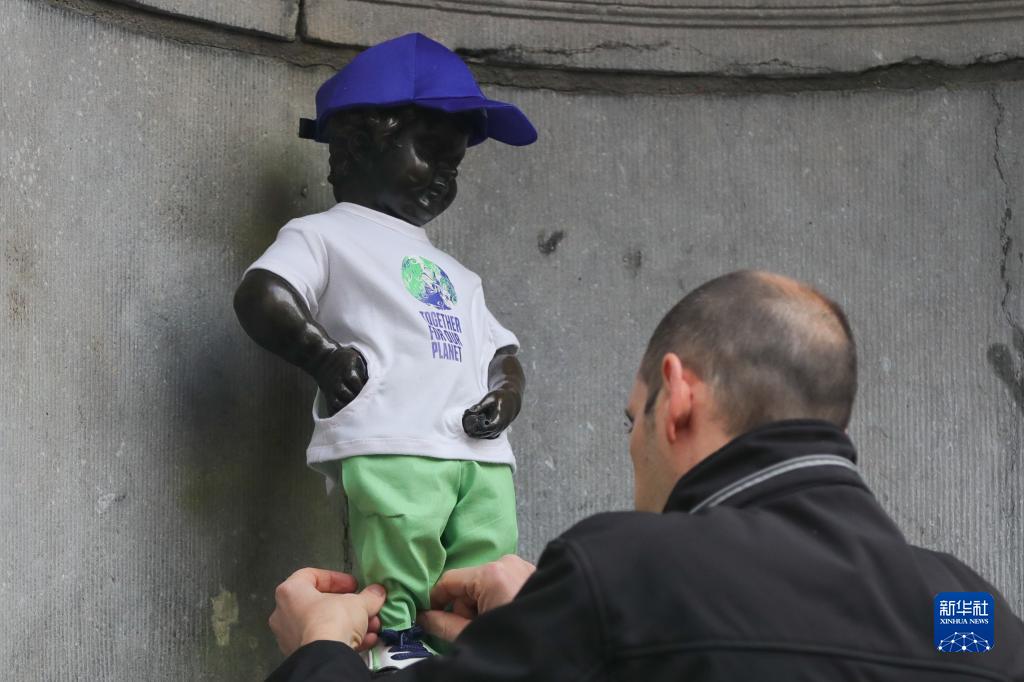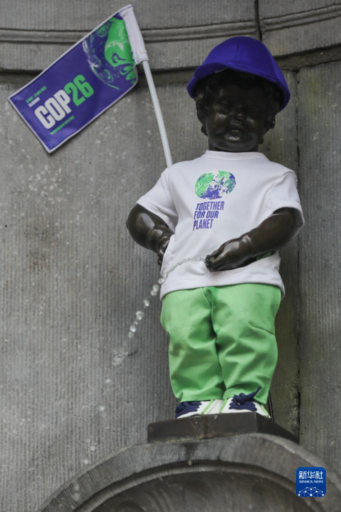 10月27日,工作人员为比利时布鲁塞尔的著名雕塑“小尿童”换上装扮,以呼应即将在英国格拉斯哥召开的《联合国气候变化框架公约》第二十六次缔约方大会。 新华社记者郑焕松摄
